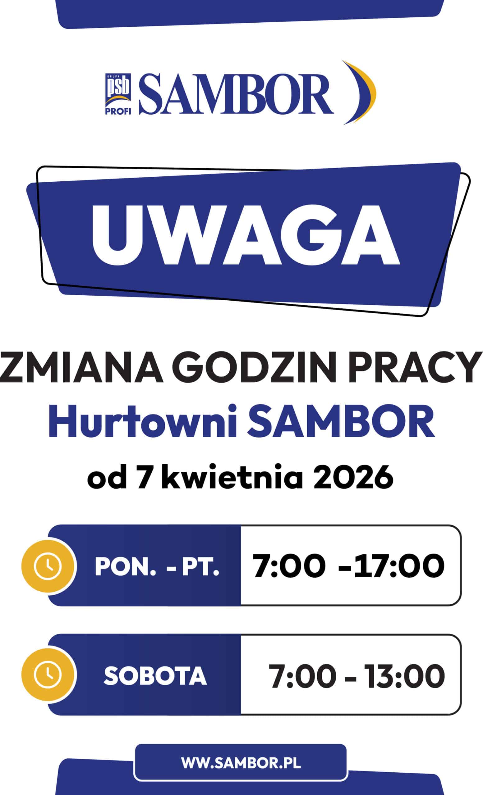 🌞 Wraz ze zmianą czasu z zimowego na letni informujemy, że od wtorku 7 kwietnia wydłużamy godziny pracy hurtowni SAMBOR w Tczewie.