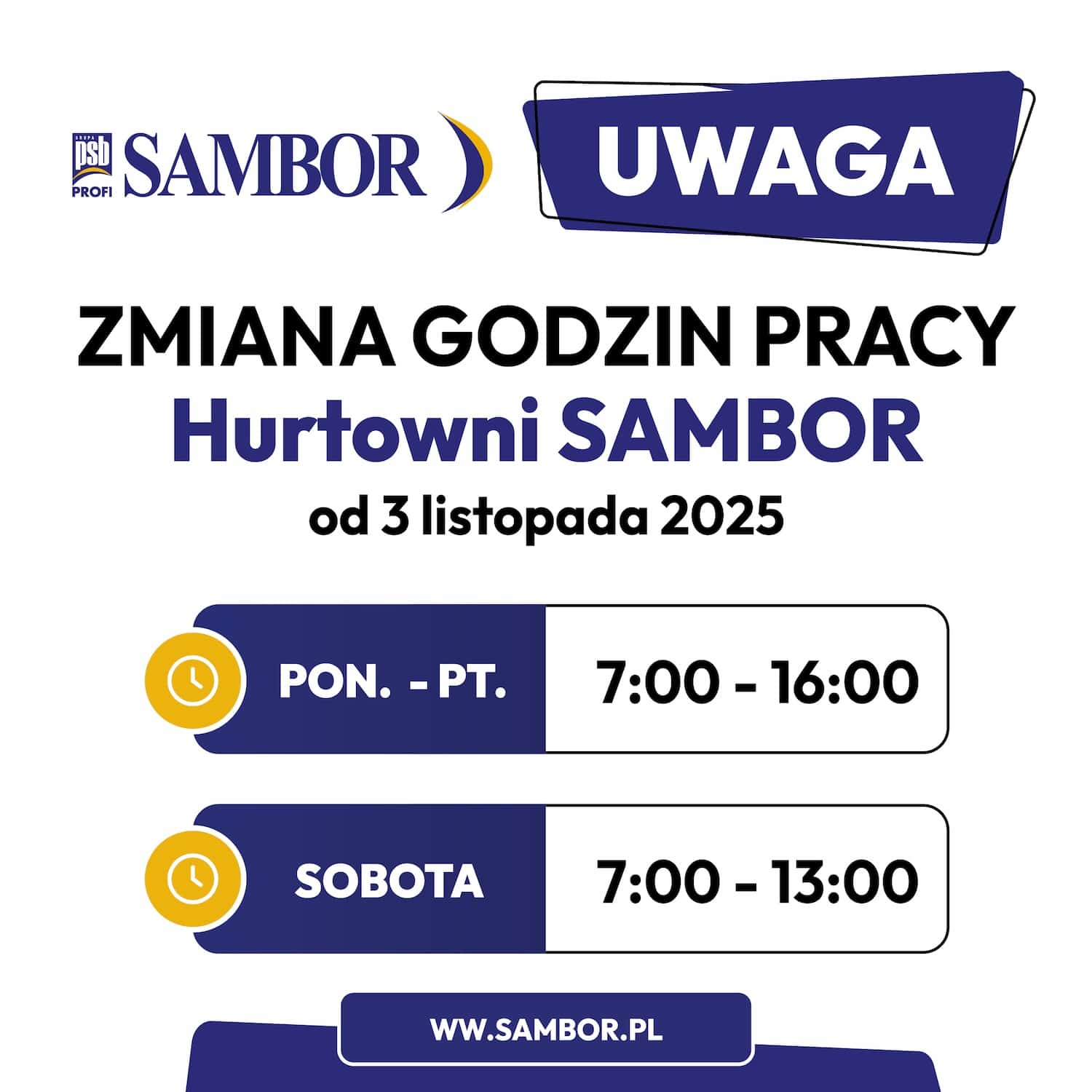Informujemy, że od 3 listopada 2025 r. zmianie ulegają godziny otwarcia naszej hurtowni.